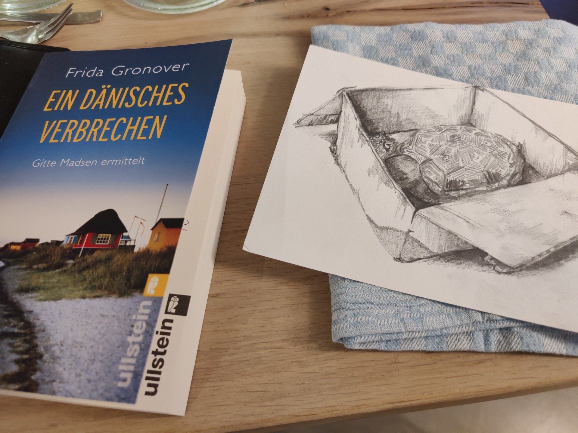 Tolle Überraschung! Bei der Lesung in Dortmund bei Kerstins nordisch-westfälisch hat eine Zuhörerin Elemente aus einigen Szenen gezeichnet. Hier Gittes Schildkröte Hieronymus. Megatoll!! Der wunderbare Büchertisch kam von der Seitenreich-Buchhandlung in Huckrade.